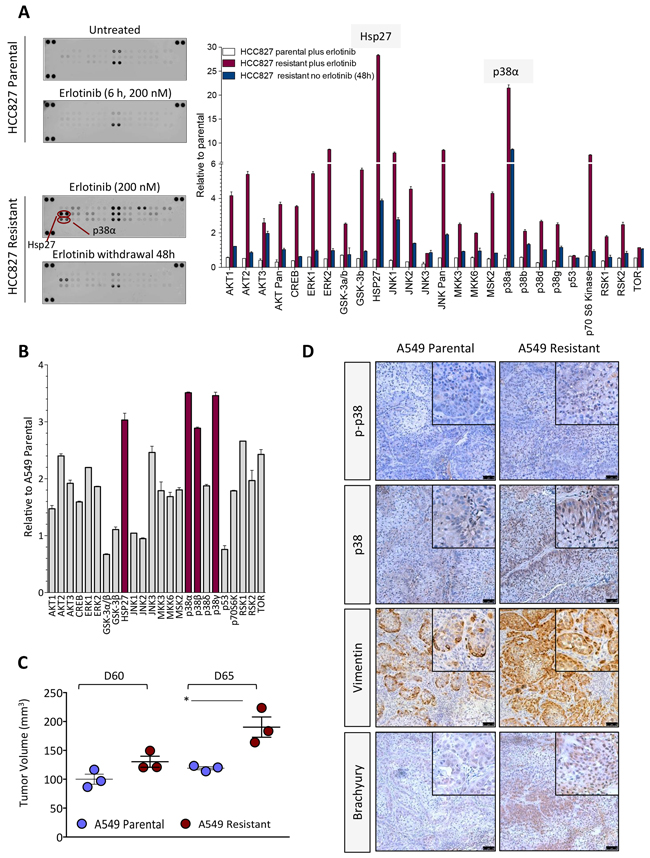 Figure 3: Kinase phosphorylation profiling in erlotinib-resistant cells. A. Kinase phosphorylation profiling in HCC827 parental vs. erlotinib-resistant cells treated as indicated. Bar graph represents the expression of each phospho-kinase (relative to untreated parental cells) in indicated cells. B. Analysis of phospho-kinases and their normalized ratio in A549 erlotinib-resistant vs. parental cells. C. Growth of A549 cells (parental vs. resistant) as subcutaneous xenografts in nude mice. Shown is the tumor volume for individual mice at days 60 and 65 post-tumor implantation. D. Immunohistochemistry analysis of p-p38, p38, vimentin and brachyury expression in xenograft tumors of parental vs. erlotinib-resistant A549 cells.