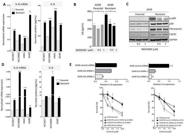 Figure 4: IL-8 signaling is upregulated in erlotinib-resistant cells. A. IL-8 expression in erlotinib-resistant vs. parental cell lines measured at the mRNA (left) and secreted protein levels (right). B. IL-8 secretion in culture supernatants of A549 parental vs. erlotinib-resistant cells left untreated or treated in vitro with indicated doses of the p38 inhibitor SB203580. C. Western blot analysis of protein lysates from indicated tumor cells treated with the p38 inhibitor. D. IL-6 expression in erlotinib-resistant vs. parental cell lines measured at the mRNA (left) and secreted protein levels (right). E. Upper panels: expression of IL-8 or IL-6 in A549 cells transfected with IL-8 or IL-6 targeting shRNA constructs (1 and 2), relative to A549 cells transfected with a control non-targeting shRNA. Bottom panels: survival of indicated tumor cells in response to various doses of erlotinib. Indicated p values were calculated by two-way ANOVA relative to A549 parental cells.
