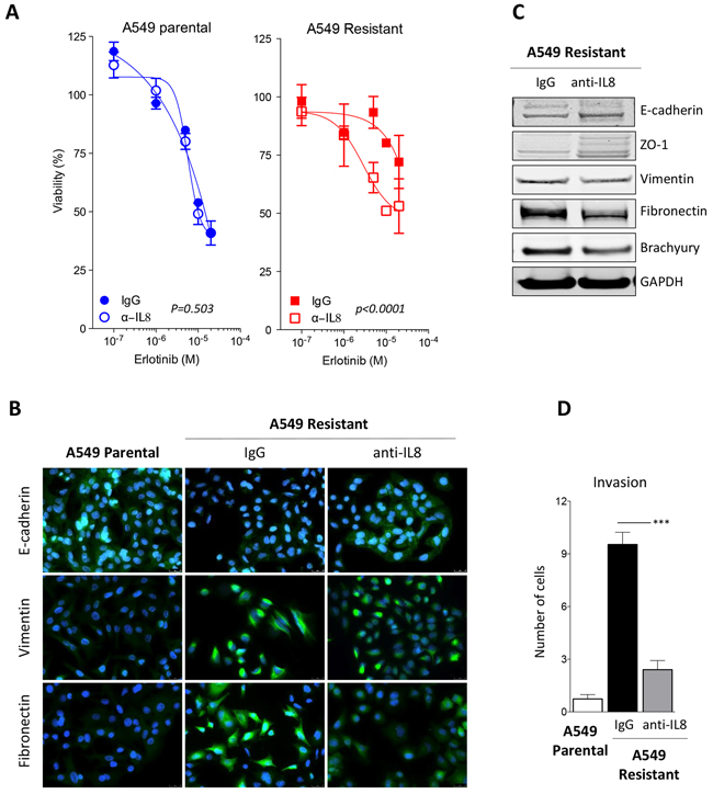 Figure 5: Blockade of IL-8 signaling reverts erlotinib resistance. A. Assessment of erlotinib response in parental vs. erlotinib-resistant A549 cells previously treated with control IgG or neutralizing anti-IL-8 antibody [p values calculated by two-way ANOVA]. B. Immunofluorescent analysis (green signal) of epithelial E-cadherin and mesenchymal vimentin and fibronectin in A549 parental vs. erlotinib-resistant cells treated with a control IgG or a neutralizing anti-IL-8 antibody. Blue signal corresponds to DAPI stained nuclei. C. Western blot analysis of indicated markers in A549 erlotinib-resistant cells treated with control IgG or anti-IL-8 antibody. D. Invasion assay performed with indicated cells treated with control IgG or anti-IL-8 antibody prior to the assay.