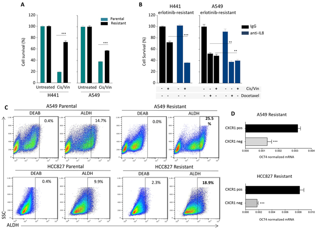 Figure 6: IL-8-dependent chemotherapy resistance and stemness. A. Survival of H441 and A549 tumor cell pairs (parental vs. erlotinib-resistant) in response to treatment with cisplatin and vinorelbine combination in culture. B. Survival of erlotinib-resistant H441 and A549 cells in response to treatment with cisplatin and vinorelbine or docetaxel. Tumor cells were cultured in the presence of control IgG or neutralizing anti-IL-8 antibody for 72 hours prior to the chemotherapy treatment. C. Analysis of Aldehyde Dehydrogenase (ALDH) activity using the Aldefluor Kit (Stemcell) in indicated tumor cell pairs. The ALDH inhibitor Diethylaminobenzaldehyde (DEAB) was used to control for background fluorescence. D. Expression of mRNA encoding for the stem cell-associated marker OCT4 inCXCR1 positive vs. negative fractions isolated from A549 and HCC827 erlotinib-resistant cells, relative to GAPDH.