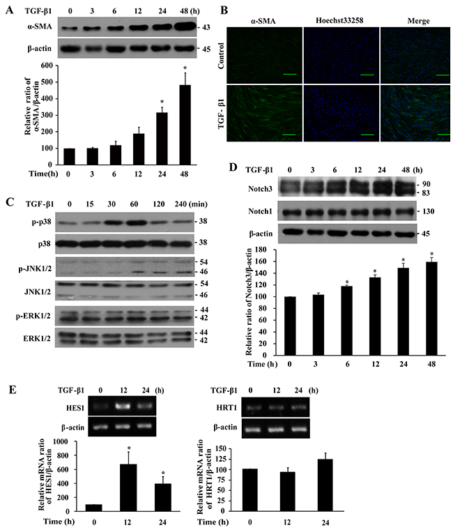 Figure 1: TGF-β1 induces differentiation, p38 and JNK1/2 phosphorylation, and Notch3 expression in IMR-90 fibroblasts. Cells were serum-starved overnight prior to treatment with TGF-β1 (200 pM) for the indicated duration. A. Western analysis of α-SMA levels. B. Immunofluorescent analysis of α-SMA expression. Green, α-SMA; blue, nuclei; bar size, 100 μm. C. Western analysis of p38, JNK1/2 and ERK1/2 phosphorylation. D. Western analysis of Notch3 and Notch1 levels. E. RT-PCR analysis of HES1 and HRT1 mRNA levels. The bands were quantified, normalized by β-actin or the respective unphosphorylated protein, and presented relative to 0 h (100%) as means ± SEM (n = 3-4). *, P < 0.05 vs 0 h.