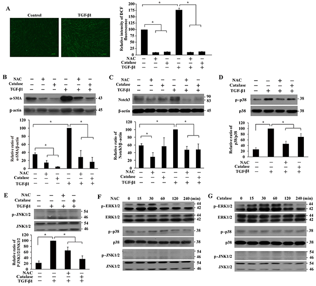 Figure 3: Effect of NAC and catalase pretreatment on basal and TGF-β1-induced α-SMA, MAPKs and Notch3 expression in IMR-90 fibroblasts. A. Induction of reactive oxygen species (ROS) by TGF-β1. IMR-90 fibroblasts were treated with TGF-β1 (200 pM, 1 h), with or without NAC or catalase pre-treatment, followed by incubation with 2’,7’-dichlorodihydrofluorescein diacetate (DCF, 10 μM, 15 min). Representative images of DCF fluorescence were shown, and ROS production was quantified and presented relative to that without any treatment as means ± SEM (n = 3; *, P < 0.05). Bar size, 100 μm. B-E. Western analyses of the effect of antioxidant pre-treatment on basal and TGF-β1-induced expression of α-SMA (B), Notch3 (C), phospho-p38 (D), and phospho-JNK1/2 (E). Cells were pretreated with NAC (4 mM, 1 h) or catalase (1000 U/L, 4 h) prior to TGF-β1 (200 pM) stimulation for 48 h (for α-SMA and Notch3) or 1 h (for p38 and JNK1/2). The expression levels were quantified and normalized with their respective controls, and presented relative to that treated with TGF-β1 alone as means ± SEM (n = 3-4; *, P < 0.05). F-G. Expression of phosphorylated ERK1/2, p38, and JNK1/2 in IMR-90 fibroblasts treated with NAC (F, 4 mM) or catalase (G, 1000 U/L) for 0-240 min.