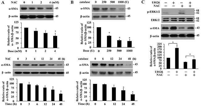 Figure 4: Basal α-SMA expression is suppressed in the presence of antioxidant or by ERK signaling. Dose- and time-dependent effect of NAC (A, 48 h, upper panels; 4 mM, lower panels) and catalase (B, 48 h, upper panels; 1000 U/ml, lower panels) treatment on α-SMA protein levels in IMR-90 cells. C. Effect of U0126 (10 µM, 1 h) on ERK1/2 phosphorylation and α-SMA protein levels in the presence or absence of NAC (4 mM, 48 h) pre-treatment. The expression levels were quantified and normalized with their respective controls, and presented relative to that without any treatment as means ± SEM (n = 3-4; *, P < 0.05 compared to controls).