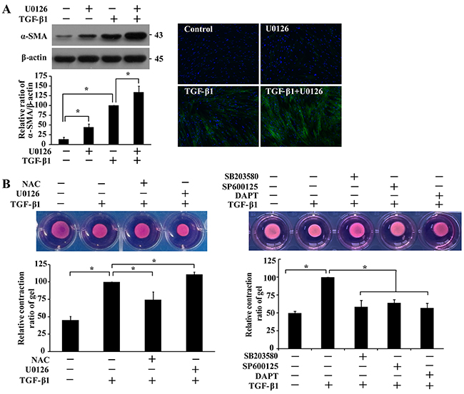 Figure 5: ERK1/2 inhibits TGF-β1-induced α-SMA expression and collagen gel contraction. A. IMR-90 cells were pre-treated with U0126 (10 μM, 1 h) prior to TGF-β1 treatment (200 pM, 48 h), followed by Western and immunofluorescence analyses. α-SMA bands were quantified and normalized with those of β-actin, and presented relative to that with only TGF-β1 treatment as means ± SEM (n = 3-4; *, P < 0.05). B. IMR-90 cells were cast into three-dimensional collagen gels and floated in medium containing NAC (4 mM), U0126 (10 μM), SB203580 (10 μM), SP600125 (20 μM) or DAPT (10 μM) for 1 h prior to treatment with TGF-β1 (200 pM). Gel size was measured daily and representative photographs on day 3 of collagen gel contraction assay were presented. Relative contraction was calculated based on the formula, [(area at day 0 – area at day 3)/area at day 0] × 100%, and normalized to that treated with TGF-β1 only. Values are means ± SEM (n = 4). *, P < 0.05.