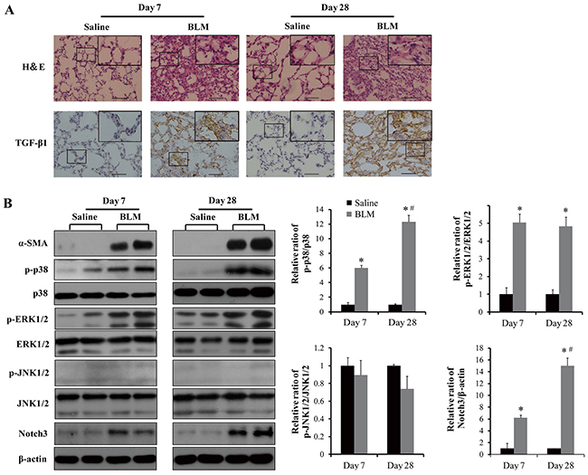 Figure 8: Analyses of phosphorylation of MAPKs, TGF-β1 and Notch3 expression in lungs of (BLM) bleomycin-injured and control mice. A. Representative images of H&E staining and TGF-β1 expression determined by immunohistochemistry. Bar size, 100 μm. B. Western blot analyses of p38, JNK1/2 and ERK1/2 phosphorylation, α-SMA and Notch3 expression. The protein bands were quantified, normalized with their non-phosphorylated counterparts or β-actin, and presented relative to that of saline-treated controls as means ± SEM (n = 3-4). *, P < 0.05 vs saline. #, P < 0.05 vs day 7.