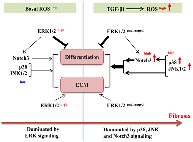 Figure 9: Schematic illustration of roles of ERK1/2, p38, JNK1/2 and Notch3 in basal and TGF-β1-induced myofibroblast differentiation. ECM, extracellular matrix; ROS, reactive oxygen species; →, lead to/activate;