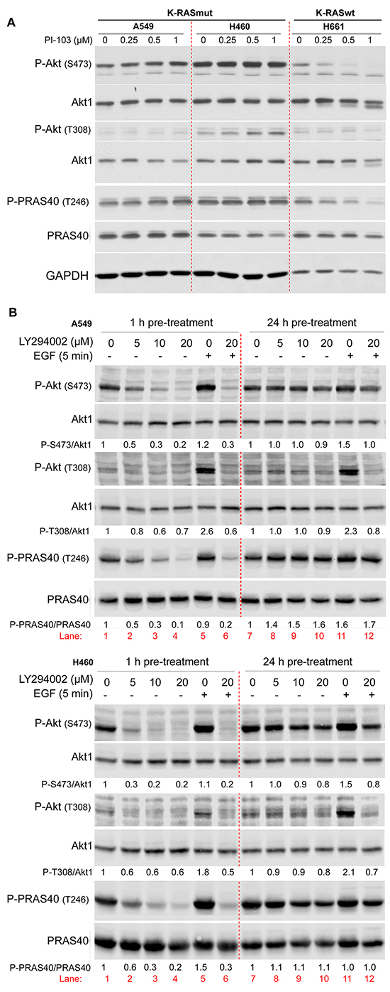 PI-103 may target mTOR in parallel to inhibiting PI3K. Because targeting mTOR complex 1 (mTORC1) by rapamycin can also lead to the reactivation of Akt [28, 29] it remains unclear whether Akt reactivity after treatment with PI-103 is due to the inhibition of PI3K or occurs due to the inhibition of mTORC1. To answer this question, the effect of LY294002 as a specific PI3K inhibitor on Akt phosphorylation was tested following 1 h and 24 h pre-treatment of A549 and H460 cells. As expected, a 1 h treatment with LY294002 inhibited the phosphorylation of Akt and PRAS40 in both cell lines in a dose-dependent manner (Figure 1B, lane 1 to lane 4). In contrast, treatment with LY294002 for 24 h did not inhibit the phosphorylation of Akt and PRAS40 (Figure 1B, lane 7 to lane 10). A 24 h pre-treatment with PI-103 may lead to the inactivation of the inhibitors and, consequently, a lack of effect on Akt activity rather than reactivation of Akt through a PI3K-independent pathway. To rule out this possibility, cells were treated with vehicle (Figure 1B, lane 5 and lane 11) or with LY294002 (20 μM) (Figure 1B, lanes 6 and 12) either for 1 h (lanes 5 & 6) or for 24 h (lanes 11 & 12), followed by stimulation with EGF for 5 min (lanes 5, 6, 11 and 12). These data indicate that EGF treatment in both cell lines led to phosphorylation of Akt (S473 and T308) (lanes 5 & 11) when compared to the non-stimulated condition in lane 1. Pre-treatment with LY294002 for 1 h inhibited basal phosphorylation as well as EGF-induced Akt phosphorylation (lane 6). Interestingly, as reflected by densitometry analysis, EGF-induced phosphorylation of Akt at S473 and T308 was completely blocked by LY294002 following 24 h pre-treatment (lane 12). This dataset indicates that PI3K activity remains blocked by PI3K inhibitors PI-103 or LY294002 during 24 h pre-treatment, and thus, reactivation of Akt is PI3K independent.