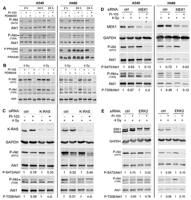 Figure 2: PI3K-independent reactivation of Akt is blocked by targeting of the components of K-RAS/MEK/ERK pathway in irradiated K-RASmut cells. A. Cells were treated with PI-103 (PI) (1 μM), PD98059 (PD) (20 μM) and the combination of PI and PD for indicated time points and protein samples were isolated. B. Cells were treated with PI, PD or the combination of PI and PD for 24 h and were mock irradiated or irradiated with 4 Gy. Protein samples were isolated 10 min post-irradiation. C-E. Cells were transfected with 50 nM of non-targeting-siRNA or K-RAS-siRNA (C) non-targeting-siRNA or MEK1-siRNA (D) andnon-targeting-siRNA or ERK2-siRNA (E). Treatment with or without PI-103 (1 μM) was performed 48 h after transfection. Cells were irradiated with 4 Gy after treatment with PI-103 for 24 h. Protein samples were isolated 10 min post-irradiation. The level of P-Akt (S473), P-Akt (T308) and P-PRAS40 (T246) in the indicated experiments were analyzed by Western blotting. The blots were stripped and incubated with antibodies against Akt1 or PRAS40. In the siRNA experiments GAPDH was detected as a loading control. Densitometry values for phosphorylated Akt represent the ratio of P-Akt-S473/Akt1 and P-Akt-T308/Akt1 normalized to 1 in PI-103 non-treated controls.