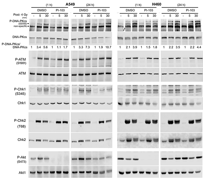 DNA-PKcs is a key enzyme involved in repair of DSBs after exposure to irradiation through NHEJ. It has been reported that activation of DNA-PKcs following irradiation leads to its autophosphorylation at S2056, which is partially dependent on Akt activity [22, 23]. Next, we tested whether short-term or long-term treatment with PI-103 differentially inhibits DNA-PKcs autophosphorylation. As shown in Figure 3, strong inhibition of P-DNA-PKcs was achieved by 1 h treatment with PI-103 in K-RASmut A549 and H460 cells. Figure 3 also indicates that diminished P-Akt levels after a 1 h pre-treatment with PI-103 could be associated with the inhibition of radiation-induced DNA-PKcs-S2056 phosphorylation at 5 min and 30 min post-irradiation in A549 and H460 cells. DNA-PKcs-S2056 phosphorylation did not change after irradiation following pretreatment with PI-103 for 24 h (Figure 3). Exposure to ionizing radiation induced the phosphorylation of ATM and the phosphorylation of the checkpoint proteins ChK1 and Chk2 in both cell lines, which were not inhibited after PI-103 treatment (Figure 3). Furthermore, we investigated whether differential effect of PI-103 on DNA-PKcs phosphorylation presented in Figure 3 is a K-RASmut specific event. To this end, K-RASwt H661 cells were treated with PI-103 for 2 h or for 24 h and irradiated with 4 Gy. Analyzing phosphorylation of DNA-PKcs at 5 min and 30 min post-irradiation revealed that PI-103 does not inhibited DNA-PKcs phosphorylation at S2056 (Supplementary Figure S1). As expected, PI-103 blocked phosphorylation of Akt after 2 h as well as after 24 h pretreatment conditions (Supplementary Figure S1).