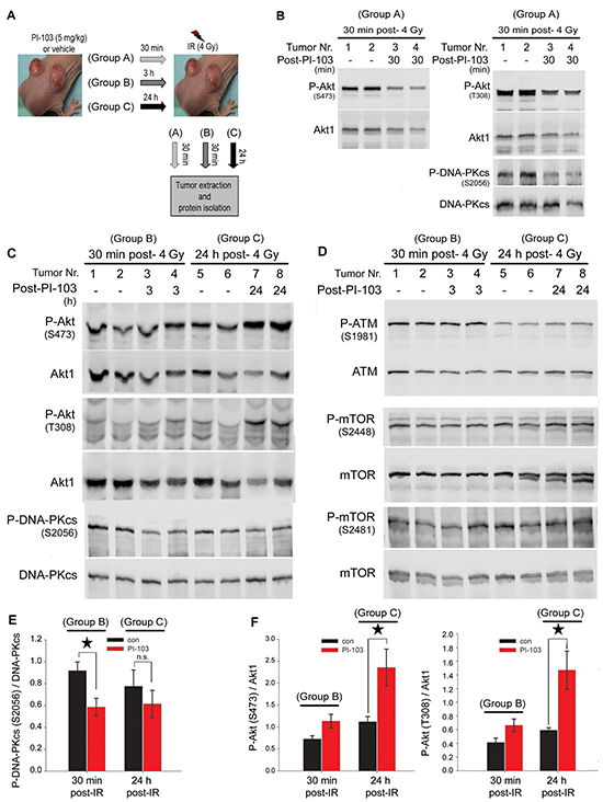 To investigate the status of Akt reactivity following short-term or long-term inhibition of the PI3K pathway in vivo, an A549 mouse xenograft study was performed. Mice were injected with A549 cells as described in the Materials and Methods section. Tumors were allowed to grow to a volume of approx. 250 mm3 (Figure 4A). Thereafter, mice were gavaged with 5 mg/kg of PI-103 or vehicle, and after 30 min (group A), 3 h (group B) or 24 h (group C), tumors were locally irradiated with a single dose of 4 Gy. The tumors were extracted either 30 min post-irradiation (group A and group B) or 24 h post-irradiation (group C). Protein samples were isolated for Western blotting analysis. Immunoblot analysis indicated that the phosphorylation levels of Akt (S473 and T308) as well as phospho-DNA-PKcs (S2056) were reduced in tumors from group A (Figure 4B). In tumors from group B, the level of Akt phosphorylation at S473 (p = 0.058) and T308 sites (p = 0.067) was not significantly affected (Figure 4C & the densitometry data in Figure 4F), but PI-103 significantly decreased the level of P-DNA-PKcs (Figure 4C & the densitometry data in Figure 4E). In group C, long-term (24 h) pretreatment with PI-103 led to enhanced phosphorylation of Akt at both phosphorylation sites (p < 0.05) (Figure 4C & the densitometry data in Figure 4F) and a lack of inhibition of P-DNA-PKcs, analyzed at 24 h post-irradiation (p = 0.44) (Figure 4C & the densitometry in Figure 4E). Similar to the in vitro data (Figure 3), PI-103 did not inhibit ATM phosphorylation either at 30 min or at 24 h post-irradiation (Figure 4D). Likewise, PI-103 did not block the phosphorylation of mTOR at S2448 and S2481 in tumors from group A or from group C (Figure 4D).