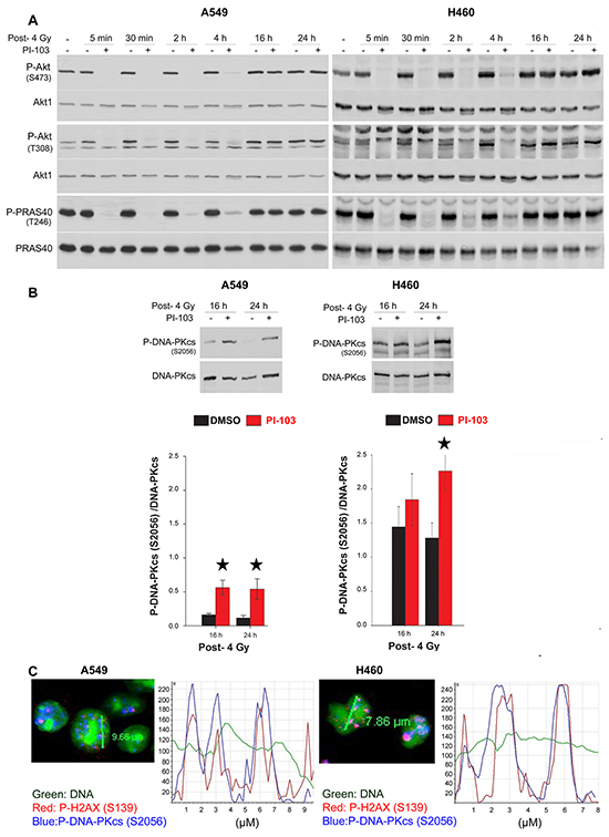 Figure 5: Short-term inhibition of Akt leads to the retention of phosphorylated DNA-PKcs to the DSBs site. A. Cells were treated with DMSO and PI-103 for 2 h at different times and irradiated with 4 Gy. Protein samples were isolated from all treated cells at the same time at indicated time-points after irradiation with 4 Gy as well as from un-irradiated control and subjected to SDS-PAGE. The levels of P-Akt (S473), P-Akt (T308) and P-PRAS40 (T246) were analyzed by Western blotting. The blots were stripped and incubated with antibodies against corresponding total proteins. B. Cells were treated with DMSO and PI-103 for 2 h and irradiated with 4 Gy. At 16 and 24 h post-IR, levels of P-DNA-PKcs and DNA-PKcs were analyzed. The densitometry values represent the mean ratios of P-DNA-PKcs (S2056)/DNA-PKcs from 3 independent experiments. Error bars: SEM (*P <0.05, Student’s t-test). Short-term inhibition of Akt leads to the retention of phosphorylated DNA-PKcs to the DSBs site. C. A549 and H460 cells were treated with PI-103 for 2 h and irradiated with 4 Gy. Twenty-four hours after irradiation, immunofluorescence of P-DNA-PKcs (S2056) and γ-H2AX was performed. Representative confocal microscopy images and related intensity graphs indicate co-localization of P-DNA-PKcs with γ-H2AX foci.