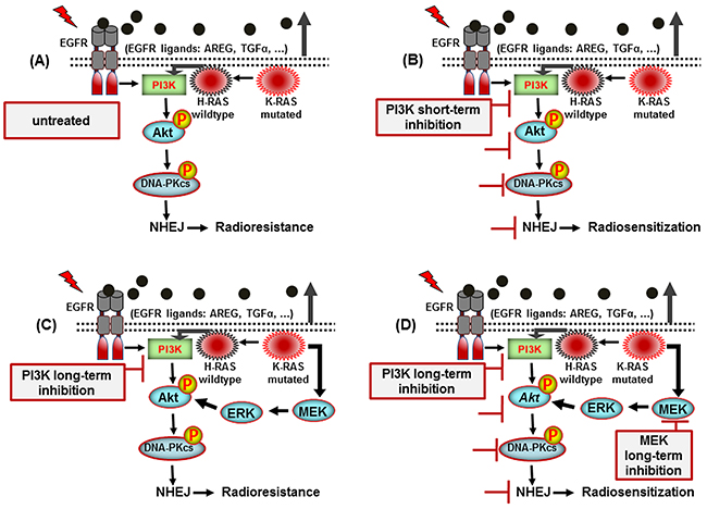 We demonstrate here, for the first time, the MEK-ERK-dependent reactivation of Akt due to a 24 h inhibition of PI3K in K-RASmut NSCLC cell lines A549 and H460 in vitro and in A549 xenografts in vivo. Reactivation of Akt accelerated the repair of radiation-induced double-strand breaks (DSBs). Dual targeting of MEK and PI3K completely blocked Akt reactivation, impaired DSBs repair through NHEJ and improved radiosensitization.