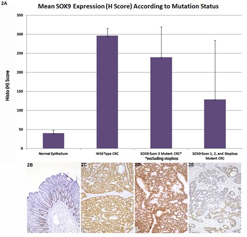 Figure 2: Mean SOX9 Expression (H Score) According to Mutation Status. A. In comparison to normal epithelium (mean H score 40±7.9), which only shows SOX9 expression in deep crypt epithelium, the majority of both SOX9 WT (mean H score = 296±19.2) and mutant CRC overexpressed SOX9. Among SOX9 mutant CRC, truncating and missense exon 3 mutants had a higher mean H score (239±80.3) in comparison to other mutants including exon 1, exon 2, and exon 3 elongating mutants resulting in loss of stop codon (mean H score = 129±155.3), p = 0.02. B. Normal colorectal epithelium has nuclear SOX9 expression restricted to deep crypts. C. Strong, nuclear SOX9 expression is seen in SOX9 wild type CRC. D. A SOX9 p. Q312X mutant with loss of the normal allele displayed strong SOX9 nuclear expression. E. A SOX9 frameshift mutants resulting in loss of the stop codon with paucity of nuclear SOX9 expression.
