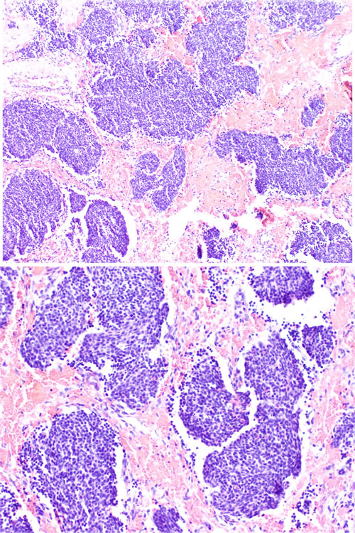 Figure 1: Low grade ONB. Nests of small, monomorphic neoplastic cells with minimal cytological atypia.