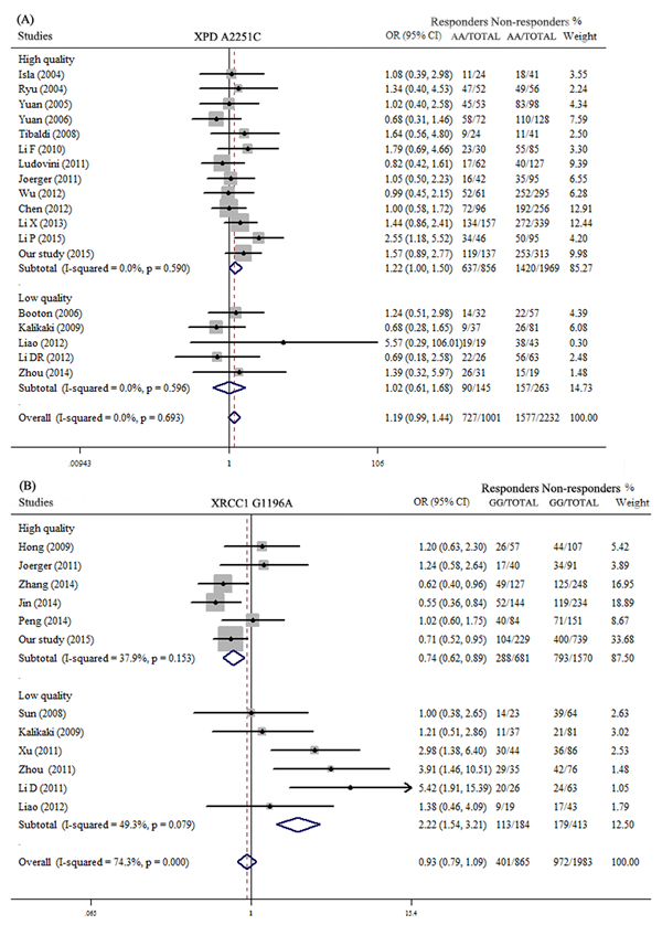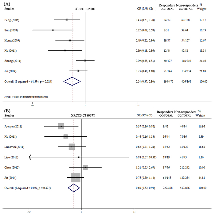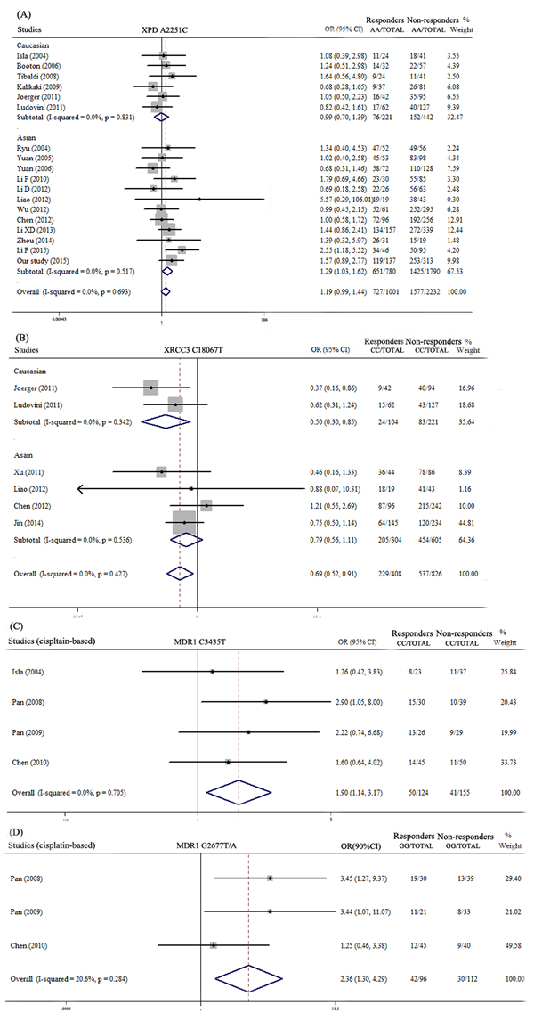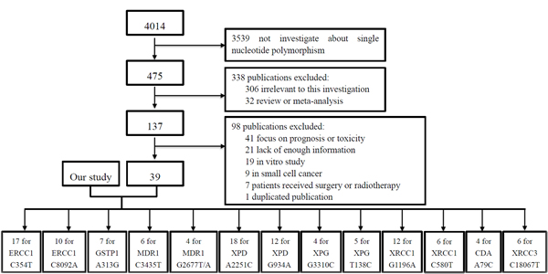 The inclusion criteria of publications were as follows: (1) studies about platinum-based chemotherapy response; (2) Patients with NSCLC; (3) the data of genotypes in responders and nonresponders could be obtained. Studies were excluded by any one of the following conditions: (1) the data of genotypes could not be provided; (2) articles involved in patients received surgery or radiotherapy.