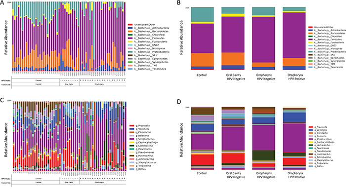 The significance of these cross-sectional findings is not yet clear. Furthermore, the microbial diversity and taxonomic composition of human oral microbiota associated with HPV positive and HPV negative tumors of the head and neck have not been examined and there have not yet been any attempts to examine the longitudinal associations between the microbiota in patients with cancer of the oral cavity and the oropharynx. Similarly, there have not been any longitudinal reports of the association between the pre- and post-treatment saliva microbiome of HNSCC.
