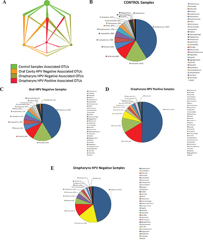 Figure 3: Nodes in Operational Taxonomic Units (OTUs) network significantly discriminate between head and neck squamous cell carcinoma (HNSCC) and normal samples in saliva. The figure was created using QIIME and imported to Cytoscape. Significant OTUs p< 0.05 were plotted in the OTU Network. Pie charts were created showcasing taxa distinguishing samples by Tumor Histology and HPV status. A. represents taxa that differed significantly in relative abundance (p<0.05) when comparing saliva from normal patients with patients with HNSCC, as well as HPV negative and HPV positive patients. The OTU network shows that the total abundance of genus Streptococcus, Dialister, and Veillonella can be used to discriminate tumor samples from control samples B. Paired taxa within family Enterobacteriaceae together with genus Oribacterium, clearly distinguish OCSCC samples C. Paired taxa within family Enterobacteriaceae together with genus Oribacterium, clearly distinguish OCSCC samples (from OPSCC and normal samples D. and E.. Similarly, only HPV positive samples have an abundance of genus Gemellaceae and Leuconostoc.