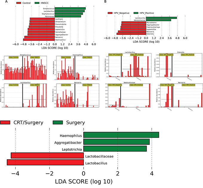 Figure 6: LDA Effect Size (LEfSe) algorithm was used on genus level OTU tables to determine taxa that best characterize each biological class: A. Comparison of HNSCC with normal samples found that Streptococcus and Lactobacillus spp. are significantly associated with HNSCC samples. Haemophilus and Neisseria spp. are related to Control samples. B. Comparison of HPV positive and HPV negative HNSCC found that Lactobacillus spp. is significantly associated with HPV positive samples in the oropharynx. Similarly, Eikenella and Neisseria spp. are associated with HPV negative samples. Patients treated with surgery had significant enrichment for Haemopilus, Neisseria, Aggregatibacter and Leptotrichia, while patients treated with CRT/Surgery had significant enrichment for Lactobacillus and Lactobacillaceae C.