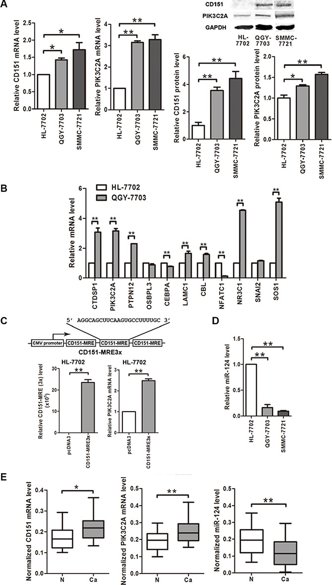 Figure 1: CD151, miR-124 and CD151’s potential ceRNA PIK3C2A are all dysregulated in HCC cells. (A) mRNA and protein levels of CD151 and PIK3C2A in cell lines were detected by quantitative RT-PCR and Western blot assays, respectively. β-actin mRNA and GAPDH protein were regarded as the endogenous normalizers. (B) mRNA levels of 11 CD151’s potential ceRNAs predicted by ceRDB database were detected by quantitative RT-PCR in HL-7702 and QGY-7703 cells. (C) A vector expressing the miR-124 reaction element within CD151 3′UTR in triplicate (CD151-MRE3x) was constructed. After transfection, CD151 MREs and PIK3C2A mRNA levels were measured by quantitative RT-PCR. (D) miR-124 level in the cell lines was measured by quantitative RT-PCR. U6 snRNA was regarded as the endogenous normalizer. (E) CD151 mRNA, PIK3C2A mRNA and miR-124 levels in 20 pairs of HCC tissues (Ca) and normal hepatic tissues (N) were detected by quantitative RT-PCR. (*p < 0.05, **p < 0.01).