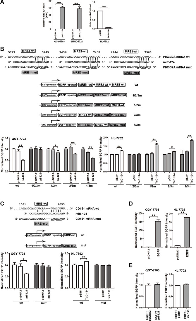 Figure 2: PIK3C2A and CD151 are direct targets of miR-124. (A) Primary miR-124 (pri-124) expression vector was used to enhance miR-124 level in QGY-7703 and SMMC-7721 cells, and miR-124 tough decoy (TuD-124) expression vector was used to inhibit miR-124 in HL-7702 cells. (B) The wild type (wt) or mutated (mut) PIK3C2A MREs with all the three MREs mutated (1/2/3m) or with every two MREs mutated (1/2m, 2/3m or 1/3m) were cloned at downstream of EGFP coding sequence. The EGFP reporter vector and pri-124 or TuD-124 plasmid were co-transfected into cell lines with RFP expression vector as the normalizer. At 48 h after transfection, cells were lysed and EGFP and RFP activities were detected. The histogram shows normalized EGFP intensity (EGFP/RFP). (C) The wild type (wt) or mutated (mut) CD151 MRE was also cloned into pcDNA3/EGFP vector, and EGFP reporter experiments were performed. (D, E) To confirm EGFP expression (D) and exclude possible nonspecific effects on EGFP intensity by miR-124 (E), plasmids were transfected into QGY-7703 or HL-7702 cells, and normalized EGFP intensity was measured. (*p < 0.05, **p < 0.01).