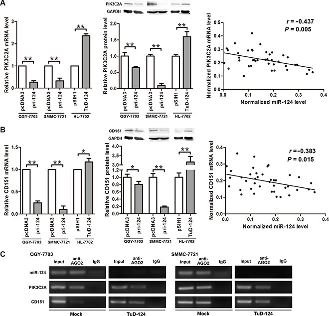Figure 3: miR-124 negatively regulates PIK3C2A and CD151 expression. (A) pri-124 or TuD-124 expression vector was transfected into cell lines, and PIK3C2A mRNA and protein levels were detected by quantitative RT-PCR and Western blot assays, respectively. Also, correlation of miR-124 and PIK3C2A mRNA levels in the 20 pairs of clinical tissue samples was analyzed. (B) Similarly, the regulation of miR-124 on CD151 expression and linear correlation between miR-124 and CD151 mRNAs were detected and analyzed. (C) RIP assay was performed in parental and miR-124-inhibited HCC cell lysate using magnetic beads conjugated AGO2 antibody. miR- 124, PIK3C2A mRNA and CD151 mRNA in the immunoprecipitated RNAs were detected by qRT-PCR. Normal mouse IgG was used as isotype control. (*p < 0.05, **p < 0.01).