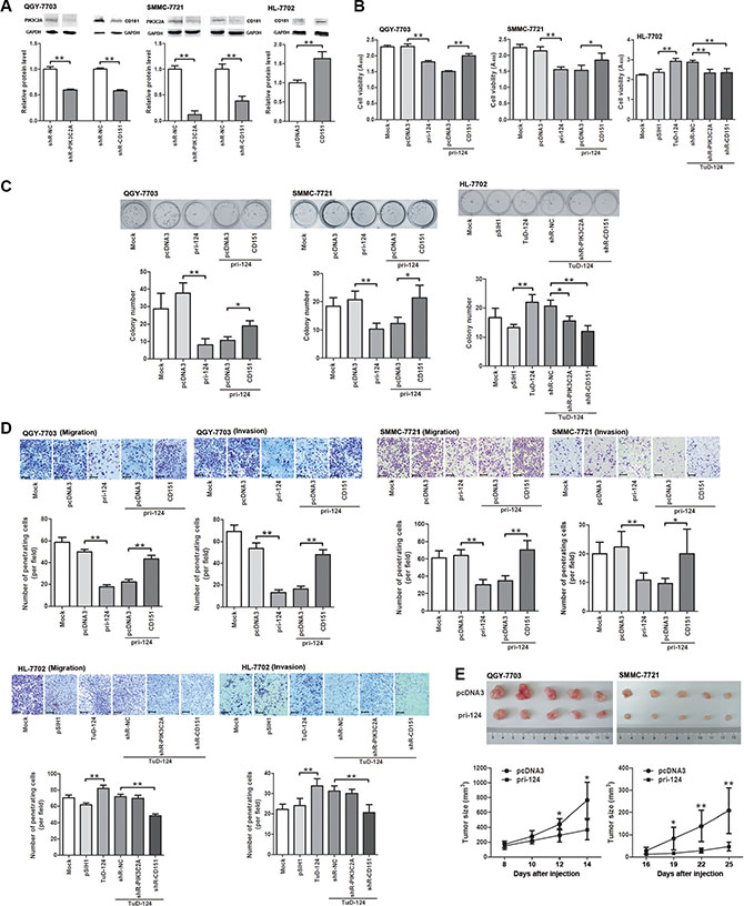 Figure 4: miR-124 alleviates malignancy of HCC cells by regulating PIK3C2A and CD151. (A) Endogenous PIK3C2A and CD151 expression was suppressed by shRNA in QGY-7703 and SMMC-7721 cells, and CD151 was forcedly expressed in HL-7702 cells. These alterations were confirmed by Western blot. (B) Cell lines were transfected and then seeded in 96-well plates. At 48 h after seeding, CCK-8 assay was performed to evaluate cell viability. The histograms show absorbance of cell cultures at 450 nm (A450). (C) Cell lines were transfected, counted and seeded in 12-well plates. After 7–8 days (QGY-7703) or 9–10 days (SMMC-7721 or HL-7702), cell colonies were counted and stained using 2% crystal violet. (D) Migration and invasion activities of transfected cells were detected using Transwell assays. The penetrating cells in 5 random view fields were counted, and average cell number per field was shown in the histograms (magnification: 100×; the scale bar indicates 100 μm). (E) QGY-7703 and SMMC-7721 cells stably expressing miR-124 were injected into right axillary fossa of nude mice to examine growth rate of the xenograft tumors. (Brightness and contrast of the cell images in (C and D) have been modified to make them accordant. *p < 0.05, **p < 0.01).