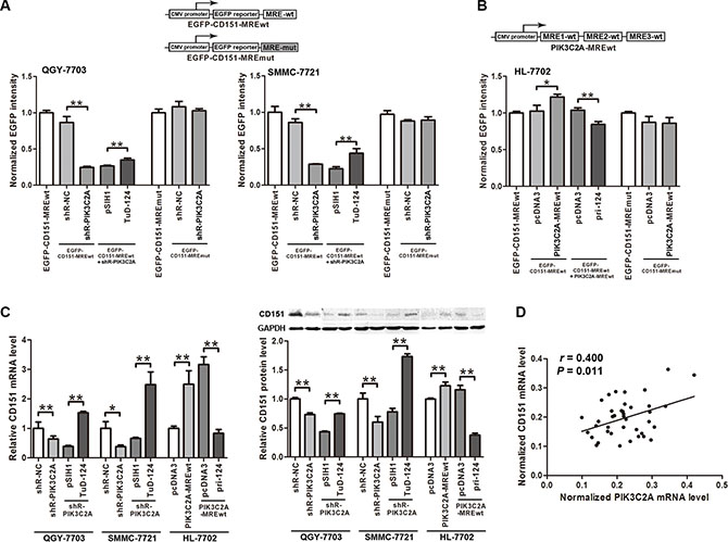 Figure 5: PIK3C2A MREs facilitate CD151 expression. (A) The pcDNA3/EGFP- CD151-MREwt and -MREmut plasmids were used as reporter vectors, which were co-transfected with other plasmids into QGY-7703 and SMMC-7721 cells to perform fluorescent reporter assays. (B) A vector expressing PIK3C2A MREs was constructed, and fluorescent reporter assays were performed in HL-7702 cells to detect the effects of PIK3C2A MREs on CD151 expression. (C) PIK3C2A MREs were suppressed followed by suppressing miR-124 in QGY-7703 and SMMC-7721 cells. Also, PIK3C2A MREs were overexpressed followed by overexpressing miR-124 in HL-7702 cells. Endogenous CD151 in these cells was measured on both mRNA and protein levels. (D) PIK3C2A mRNA and CD151 mRNA levels in clinical tissues were detected, and linear correlation between these two RNA transcripts was analyzed. (*p < 0.05, **p < 0.01).