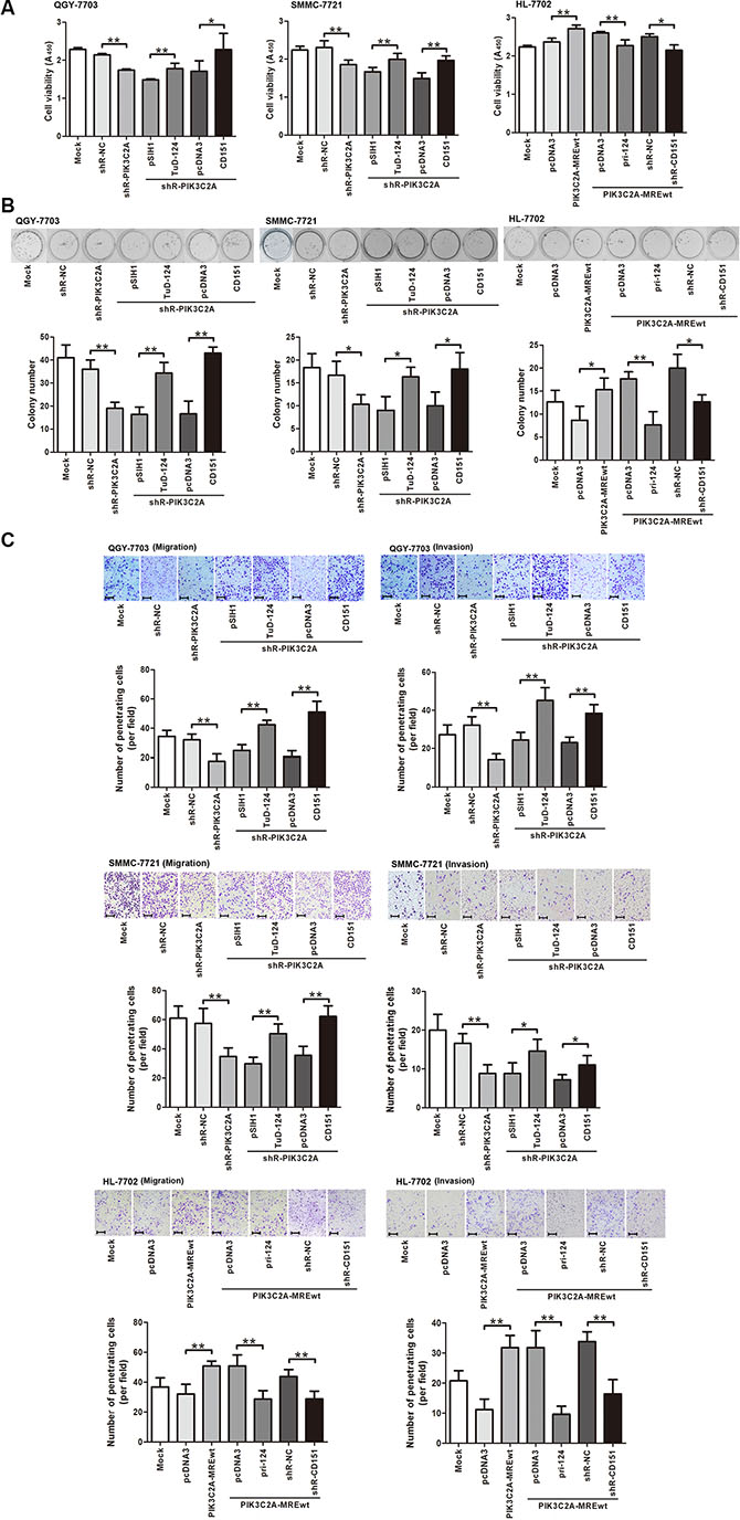 Figure 6: PIK3C2A MREs enhance HCC cell malignancy by alleviating miR-124 mediated CD151 suppression. (A) Endogenous PIK3C2A MREs were inhibited by shRNA (shR-PIK3C2A), and miR-124 repressor (TuD-124) or CD151 ectopic expression vector was further transfected in QGY-7703 and SMMC-7721 cells. In HL-7702 cells, PIK3C2A MREs were overexpressed and pri-124 or CD151 shRNA expression vector (shR-CD151) was further transfected. CCK-8 assay was performed to evaluate cell viability. (B) Cell lines were transfected as described in (A), and colony formation activity was detected. (C) Cell lines were transfected as described in (A), and migration and invasion activities of these cells were measured by Transwell assays (magnification: 100×; the scale bar indicates 100 μm). (Brightness and contrast of the cell images in B and C have been modified to make them accordant. *p < 0.05, **p < 0.01).