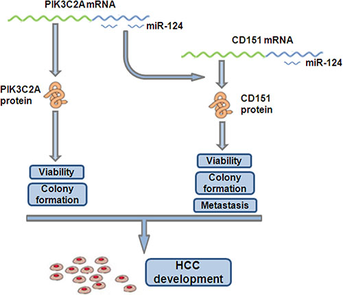miR-124 directly targets PIK3C2A and CD151 mRNAs in HCC cells and normal hepatocytes