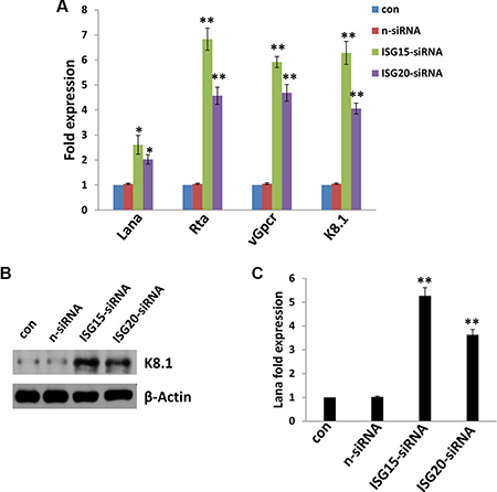 Figure 3: Targeting ISG15 and/or ISG20 induces KSHV lytic reactivation from infected primary oral fibroblast cells. (A–B) PDLF were first incubated with purified KSHV (MOI~10) for 2 h, then after 24 h p.i. transfected with either control non-target (n-siRNA), ISG15-siRNA or ISG20-siRNA for additional 48 h. Viral representative latent (Lana) and lytic gene (Rta, vGpcr, K8.1) transcripts were quantified using qRT-PCR. Protein expression was measured by immunoblots. (C) Released virions was isolated and purified from supernatant from groups in (A), then used to infect fresh PDLF cells. After 24 h p.i., Lana transcripts were quantified using qRT-PCR. Error bars represent the S.E.M for three independent experiments. * = p < 0.05, ** = p < 0.01 (vs n-siRNA group).