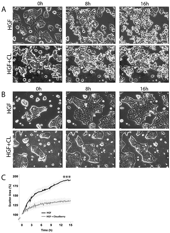 Figure 1: Cloudberry extract inhibits HGF-induced cell scattering in colon adenocarcinoma cells. A. HT29 and B. HCA7 cells were treated either with 40 ng/ml HGF or HGF together with 5 μL/mL cloudberry extract (CL) and followed every 5 min by time-lapse microscopy for 16 hours. Time points 0, 8 h and 16 h are shown in this figure and the movies are available in Supplementary Materials (Movies S1-S4). C. Scatter areas were analyzed quantitatively every 5 min by determining the percentage of scatter area as compared to the area at time 0. Results (mean +/- SEM) from 4 independent experiments for HCA7 cells (P<0.001 (marked with *** in the figure) HGF vs. HGF+Cloudberry treatment).