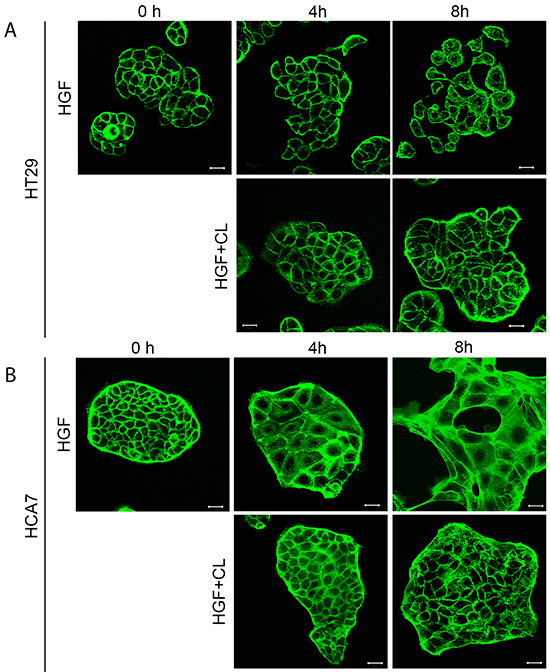 Figure 2: Cloudberry extract prevents HGF-induced morphological changes in colon adenocarcinoma cells. A. HT29 and B. HCA7 cells on glass cover slips were treated with 40 ng/ml HGF or HGF together with 5 μL/mL cloudberry extract (CL) for 0 h, 4 h and 8 h, fixed and stained for actin filaments with FITC-phalloidin and imaged by confocal microscopy. Bars, 25 μm.