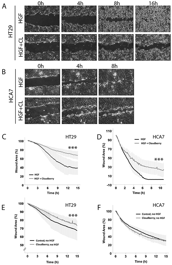 Figure 3: Cloudberry extract inhibits HGF-induced scratch wound closure both in HT29 and HCA7 colon adenocarcinoma cell lines, but without HGF stimulation in HT29 cells only. Monolayers of A. HT29 and B. HCA7 cells were scratch wounded and the HGF-stimulated closure of the wounds was monitored every 5 min by time-lapse microscopy (Movies S5-S8 in Supplementary Materials). C-F. Wound areas were analyzed quantitatively every 5 min by determining the percentage of remaining wound area as compared to the area of the wound at time 0. Results (mean +/- SEM) from 3 independent experiments with HGF stimulation are shown for HT29 and HCA7 cells (C and D. P<0.001 (***) HGF vs. HGF+Cloudberry). Without HGF stimulation, cloudberry extract (CL) inhibited scratch wound closure in HT29 (E) P<0.001 (***) control vs. cloudberry) but not in F. HCA7 cells (mean +/- SEM from 3 independent experiments).