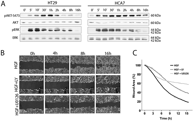 Figure 4: PI3K and ERK are required for HGF-induced migration. A. HGF activates AKT and ERK in HT29 and HCA7 colon adenocarcinoma cells as shown by western blot analysis. B. Scratch wound healing is dependent on PI3K/AKT and ERK activation as treating the HT29 cells with the PI3K inhibitor LY294002 (LY) and the MAPKK (MEK) inhibitor U0126 prevents wound closure as determined by time-lapse microscopy. C. Wound areas in HGF-stimulated HT29 cells treated with LY294002 (mean from two independent experiments), U0126 (one experiment) and without inhibitors (mean from 3 independent experiments) were analyzed quantitatively every 5 min by determining the percentage of remaining wound area as compared to the area of the wound at time 0.