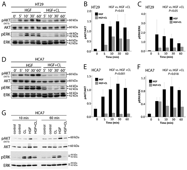 Figure 5: Cloudberry extract inhibits HGF-induced AKT and ERK activation. A. HT29 and D. HCA7 cells were analyzed by SDS-PAGE and western blotting with antibodies against phospho-AKT(Ser473), phospho-ERK, and total AKT and ERK. Quantification of western blots of pAKT/AKT (HGF vs. HGF + CL, P=0.03) and pERK/ERK (P=0.05) levels in HT29 B-C. and HCA7 (E-F. P<0.001 and P=0.018, respectively) cells from 3 independent experiments. G. The effect of cloudberry extract in the absence of HGF Error bars indicate SEM.
