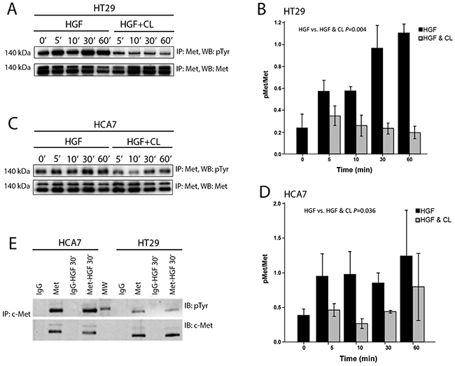 Figure 6: Cloudberry extract inhibits tyrosine phosphorylation of the Met receptor in HGF-treated colon adenocarcinoma cells. HGF or HGF and cloudberry extract (CL) treated A. HT29 and C. HCA7 cells were lysed, immunoprecipitated with antibody against the Met receptor, and immunoblotted with anti-phosphotyrosine antibody (pTyr), followed by immunoblotting with anti-Met antibody. Quantification of western blots of pMet/Met levels in HT29 (B. P=0.004 HGF vs. HGF+Cloudberry) and HCA7 (D. P=0.036) cells from 3-4 independent experiments. Error bars indicate SEM. E. HT29 or HCA7 cells treated with or without HGF for 30 min were lysed, immunoprecipitated with control IgG or anti-Met antibody, and immunoblotted for anti-phosphotyrosine antibody and anti-Met antibody. Blots are representative of 3 independent experiments. MW, molecular weight markers.