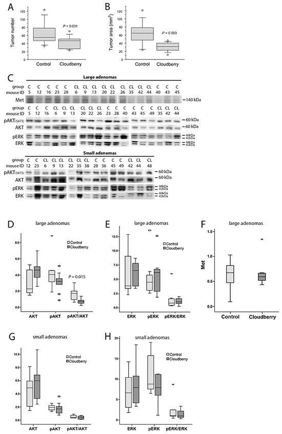 Figure 7: Cloudberry feeding inhibited intestinal tumorigenesis in the Min mouse. A. The number of tumors and B. the tumor area (burden) in cloudberry-fed Min mice (n = 10-12 / group) were decreased in comparison to control-fed mice as reported previously [22]. C. Levels of Met, pAKT, AKT, pERK, and ERK in large adenomas (diameter > 1.5 mm), and levels of pAKT, AKT, pERK, and ERK in small adenomas (diameter < 1.0 mm) from each mouse in the control (C) and cloudberry-fed (CL) groups were analyzed by western blotting. D. The large adenomas from cloudberry-fed mice showed a significant reduction in the relation of pAKT/AKT levels. G. A similar but non-significant trend was seen in small adenomas of the cloudberry-fed mice. No significant differences were seen between the control and cloudberry groups either in E, H. ERK or in F. Met levels. In box and whiskers plots, a circle indicates an outlier and an asterisk (*) a far outlier.