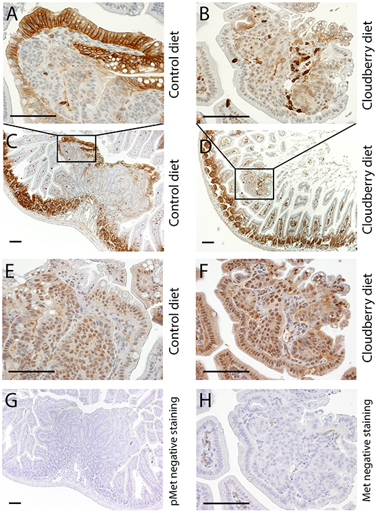 In this study we analyzed the signaling pathways involved in Met activation in adenoma samples from the control and cloudberry-fed mice. We analyzed pAKT, AKT, pERK and ERK levels by western blotting separately in small (<1 mm) and large (>1.5 mm) diameter adenomas using a representative tumor sample from each mouse in the control (n=9) and cloudberry groups (n=9; Figure 7C). The sample per mouse was obtained by excising all tumors from the intestine and pooling them according to the size category. The resulting bands were quantified by densitometric analyses and the ratio between the phosphorylated form and total AKT and ERK levels was used as a measure of their activation status. Large adenomas of cloudberry-fed mice showed a significant reduction in the ratio of pAKT/AKT in comparison to adenomas from the control mice (Figure 7C and 7D; P=0.015, Mann-Whitney U test), and a similar but non-significant trend was seen in small adenomas (Figure 7C and 7G). No differences in ERK activation was found either in small (Figure 7H) or large diameter adenomas (Figure 7E). We also analyzed total Met levels in large adenomas but found no differences between the dietary groups (Figure 7C and 7F) even though the variation in Met levels was notably smaller in the cloudberry-fed group (Figure 7F). As we were not able to reliably determine pMet levels in the adenoma by western blotting, we utilized paraffin-embedded intestinal tissue samples collected from four control and seven cloudberry-fed mice to stain pMet and Met by immunohistochemistry (Figure 8). Adenomas from control mice had a strong positive staining of pMet at the edge of tumors (Figure 8A and 8C) whereas in cloudberry-fed mice pMet predominantly localized in the crypt area of the mucosa (Figure 8D; as also observed in control mice), not in the adenoma (Figure 8B). Unlike in human colorectal cancer, in which Met is clearly expressed [8], one earlier study [40] found no Met overexpression in tumors of Min mice and Met levels in general were near the detection limit in adult Min mouse gut. pMet was not measured, and thus they did not analyze Met activity [40].