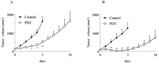 Figure 1: Inhibition of tumor growth of PDT with G-chlorin. CT26 cells were inoculated into the dorsal skin of immunocompetent or immunodeficient mice at a concentration of 1 × 106 cells/200 μL in PBS. Tumor-bearing mice were intravenously injected with 6.25 μmol/kg G-chlorin and, after 4 hours, were illuminated with 660-nm LED light (40 J/cm2). Each group comprised five mice. Data are mean ± SD. Significance was determined by Welch’s t-test. * P < 0.05, ** P < 0.01 relative to control. (A. immunocompetent mice, B. immunodeficient mice)