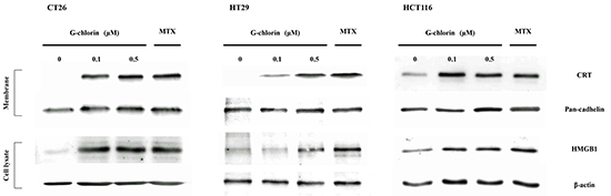 Figure 2: Expression of CRT and HMGB1 by PDT. CT26, HT29, or HCT116 cells were loaded with G-chlorin for 4 hours and then irradiated with 16 J/cm2 of 660-nm LED light. CT26, HT29, and HCT116 cells were incubated with 1 μM mitoxantrone (MTX) as a positive control. CRT or HMGB1 protein expression was measured by western blotting at 4 hours after treatment.
