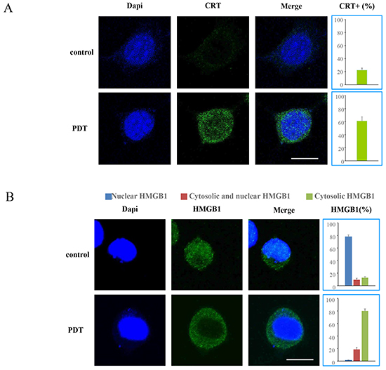 Figure 3: Translocation of CRT and HMGB1 by PDT. CT26 cells were loaded with G-chlorin for 4 hours and irradiated with 16 J/cm2 of 660-nm LED light. Translocation of CRT and HMGB1 was assessed by immunofluorescence staining at 4 hours after treatment with PDT with G-chlorin. Images were obtained using confocal microscopy (original magnification ×1000; scale bar = 10 μm). Data are means of three independent experiments ± SD. (A. CRT, B. HMGB1)