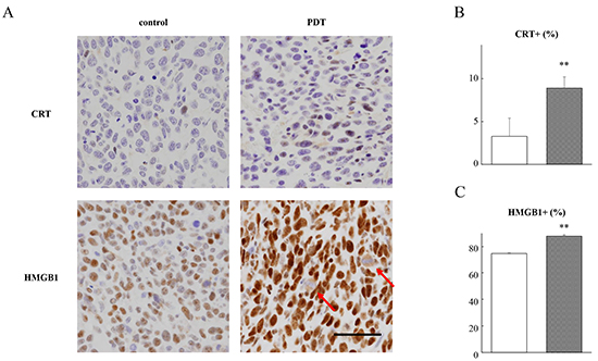 After PDT plus G-chlorin treatment of the tumors in vivo, the expression levels of CRT and HMGB1 were measured by immunohistochemistry. CRT and HMGB1 were stained in the nucleus of most tumor cells. After PDT treatment, both CRT and HMGB1 were significantly stained in the tumor cells (Figure 4A). Additionally, staining of cytoplasmic HMGB1 was observed in a few tumor cells (Figure 4A, arrows). There was also a significant increase in the labeling index of CRT and HMGB1 in the tumors (Figure 4B, 4C).