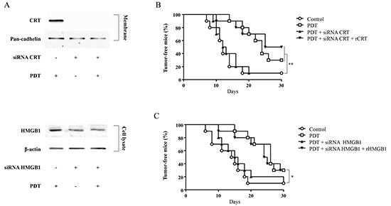 Figure 5: Vaccination. A. Knockdown of CRT or HMGB1 by using short interfering RNA (siRNA). CT26 cells were transiently transfected with siRNAs against CRT or HMGB1. CRT or HMGB1 protein expression was analyzed by western blotting at 48 hours after transfection. B, C. CT26 cells treated in vitro with G-chlorin-PDT were inoculated subcutaneously into BALB/c mice. After 7 days, mice were re-challenged with live CT26 cells. The percentages of tumor-free mice were pooled. Each group comprised ten mice. Significance was determined by the log-rank statistic. * P < 0.05, ** P < 0.01 relative to control. (B; CRT, C; HMGB1)