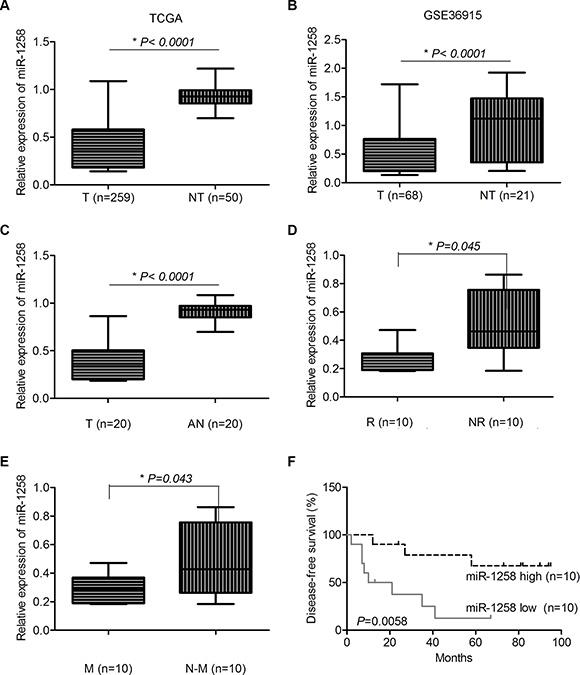Figure 1: miR-1258 was significantly downregulated in HCC and associated with patients’ survival. (A and B) The normalized relative expression level of miR-1258 in HCC tumor and non-tumor samples in TCGA (A) and GSE36915 dataset (B) (T: Tumor, NT: Non-Tumor). (C) The normalized relative expression of miR-1258 in 20 pairs of HCC and adjacent normal samples by RT-qPCR analysis (T: Tumor, AN: Adjacent Normal). (D and E) The expression of miR-1258 was associated with tumor recurrence (D) and metastasis (E) (R: Recurrence, NR: Non-Recurrence, M: Metastasis, N-M: Non-Metastasis). (F) The expression of miR-1258 was significantly associated with patients’ survival.