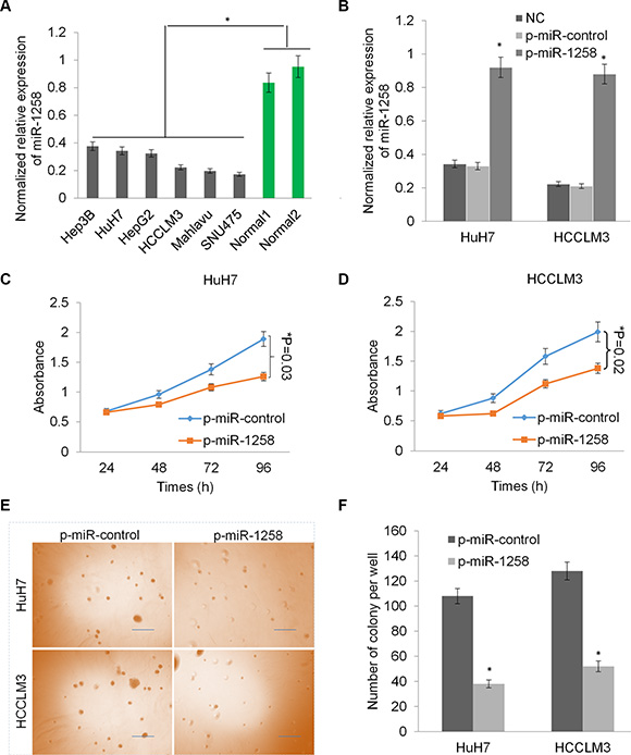 Figure 2: Overexpression of miR-1258 inhibits liver cancer cell growth and proliferation. (A) The normalized relative expression of miR-1258 in a panel of liver cancer cells and two normal liver tissues by RT-qPCR analysis. (B) The expression of miR- 1258 was significantly increased in HuH7 and HCCLM3 cells transfected with p-miR-1258 plasmid compare with p-miR-control plasmid transfection or normal control (NC). (C and D) Overexpression of miR-1258 in HuH7 (C) and HCCLM3 (D) significantly inhibits liver cancer cells growth by MTS analysis. (E) The represent images of soft agar colony formation in HuH7 and HCCLM3 cell transfected with p-miR-1258 or p-miR-control. (F) The number of colonies formed in in HuH7 and HCCLM3 cell transfected with p-miR-1258 or p-miR- control was counted under the microscope. All data are given as mean ± SD of three independent experiments. Significant differences are indicated, *P < 0.05.