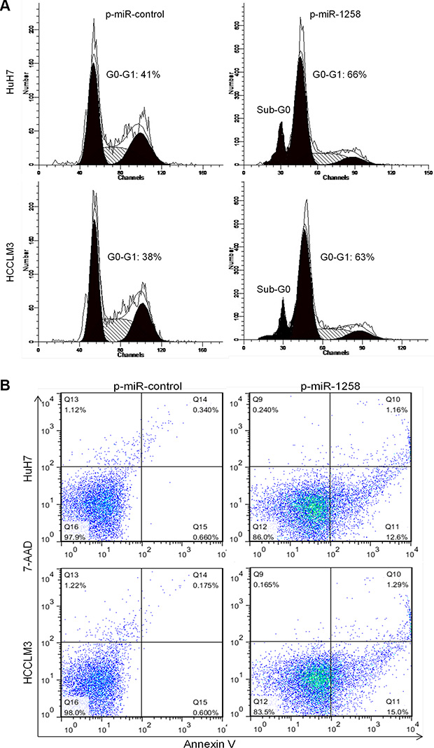 Figure 3: miR-1258 induces cell cycle arrest in G0/G1 phase and promotes cell apoptosis. (A) Cell cycle distribution and apoptosis were evaluated by flow cytometry analysis performed 2 days after HuH7 and HCCLM3 cell transfected with p-miR-1258 or p-miR-control. Note that overexpression of miR-1258 induced cell cycle arrest in G0-G1 phase and dramatic increase in the percentage of cells with sub-G0 DNA content (indicative of apoptosis). (B) Representative images of Annexin V/7-AAD apoptotic assay showing that the percentage of Annexin V+ apoptotic cells was significantly increased in HuH7 and HCCLM3 cell transfected with p-miR-1258 in comparison to the p-miR-control transfected cells.