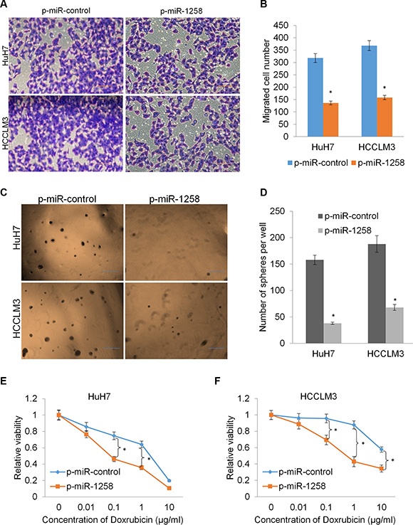 Figure 4: miR-1258 suppresses cell migration and stemness to increase drug sensitivity. (A and B) The representative images (A) and number of migrated cells (B) in HuH7 and HCCLM3 cell transfected with p-miR-1258 or p-miR-control. (C and D) The representative images (C) and number of tumor spheres (D) in HuH7 and HCCLM3 cell transfected with p-miR-1258 or p-miR-control. (E and F) overexpression of miR-1258 sensitizes the HuH7 and HCCLM3 cell to doxorubicin by MTS analysis. All data are given as mean ± SD of three independent experiments. Significant differences are indicated, *P < 0.05.