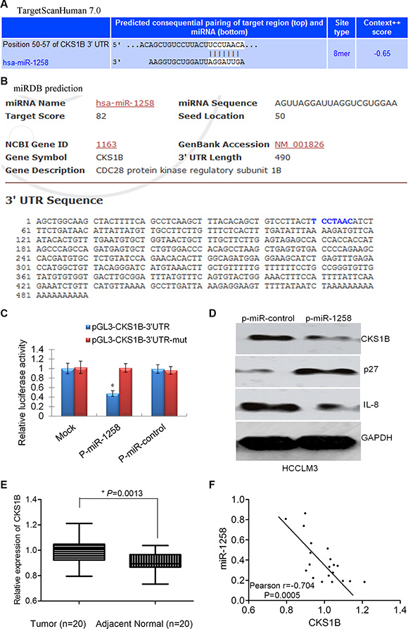 Figure 5: CKS1B was identified as the critical downstream target of miR-1258. (A) The binding site of CKS1B with miR- 1258 was predicted by TargetScanHuman 7.0 (A) or miRDB (B) (http://mirdb.org/miRDB/). (C) The normalized relative luciferase activity of HCCLM3 cells contransfected with p-miR-1258 or p-miR-control and pGL3- CKS1B-3’UTR wide type or pGL3- CKS1B-3′UTR-mutatant. (D) The representative images of western blot analysis showing that overexpression of miR-1258 inhibits the expression of CKS1B. The downstream p27 was increased while IL8 was decreased. (E) The normalized relative expression of CKS1B in 20 pairs of HCC and adjacent normal samples by RT-qPCR analysis. (F) The significant correlation between the expression of mR-1258 and CKS1B was observed in our tissue samples.