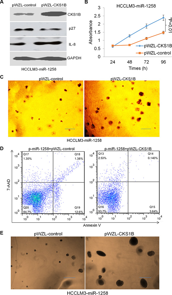 Figure 6: Re-expression of CKS1B overcomes miR-1258 induced apoptosis and increases stemness. (A) The representative images of western blot analysis showing that re-expression of CKS1B inhibits p27 expression and promotes IL8 expression. (B) Re-expression of CKS1B significantly promotes liver cancer cells growth by MTS analysis. (C) The represent images of soft agar colony formation showing that re-expression of CKS1B promotes liver cancer cell growth. (D) Representative images of Annexin V/7-AAD apoptotic assay showing that the percentage of Annexin V+ apoptotic cells was significantly decreased by CKS1B overexpression. (E) The represent images of sphere formation showing that re-expression of CKS1B promotes liver cancer cell sphere formation ability.