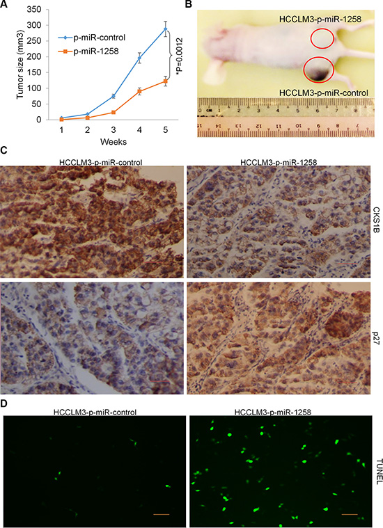 Figure 7: Stable overexpression of miR-1258 decreases tumorigenicity of HCC cells. (A) Determination of the tumor growth. Tumor volume was calculated every week after injection. Data were mean ± SD of three independent experiments. *P = 0.0012. (B) Representative image of tumor formation. Nude mice were subcutaneously injected with 5 × 106 P-miR-1258 or P-miR-control stable transfected HCCLM3 cells. (C) The Representative images of immunohistochemistry (IHC) analysis showing that the expression of CKS1B was significant decreased while p27 was significantly increased by overexpression of miR-1258. (D) Representative images of TUNEL staining of tumor tissues showing that overexpression of miR-1258 significantly promotes tumor cell apoptosis.